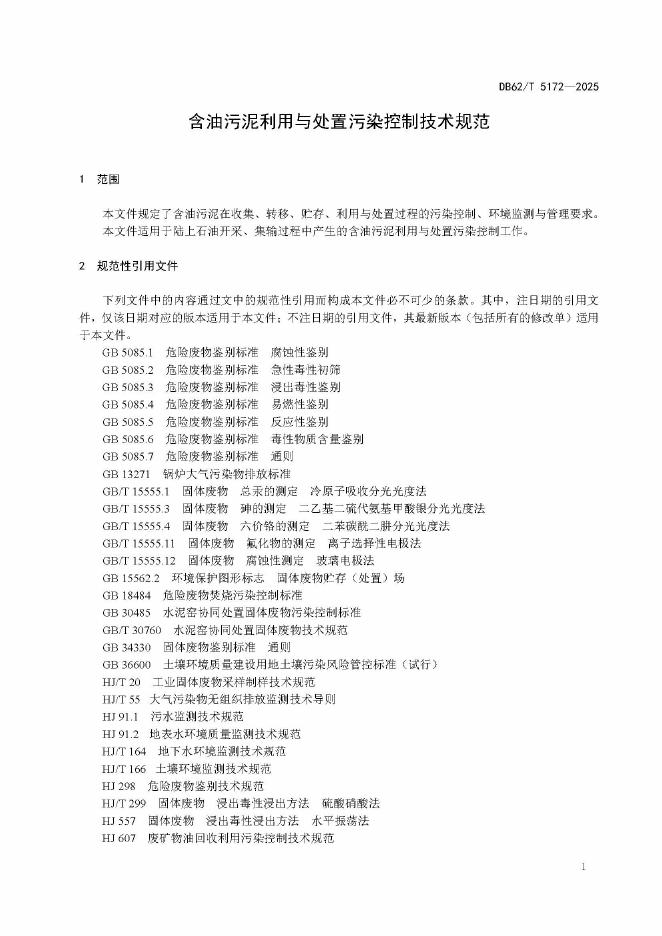 DB62/T 5172-2025 含油污泥利用与处置污染控制技术规范
