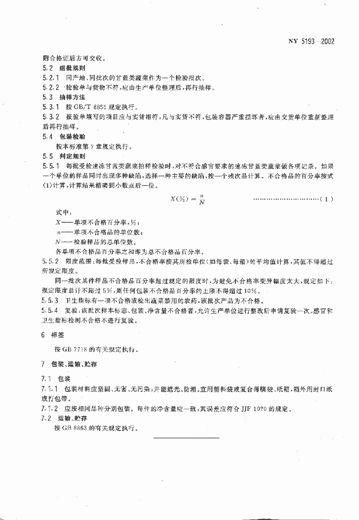 NY 5193-2002 无公害食品 速冻甘蓝类蔬菜
