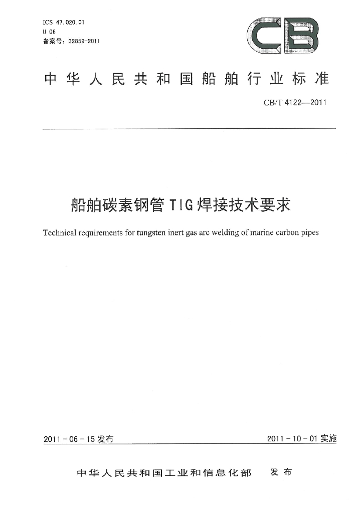 CB/T 4122-2011 船舶碳素钢管TIG焊接技术要求