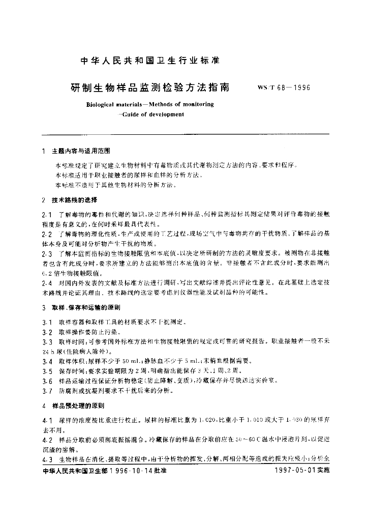 WS/T 68-1996 研制生物样品监测检验方法指南