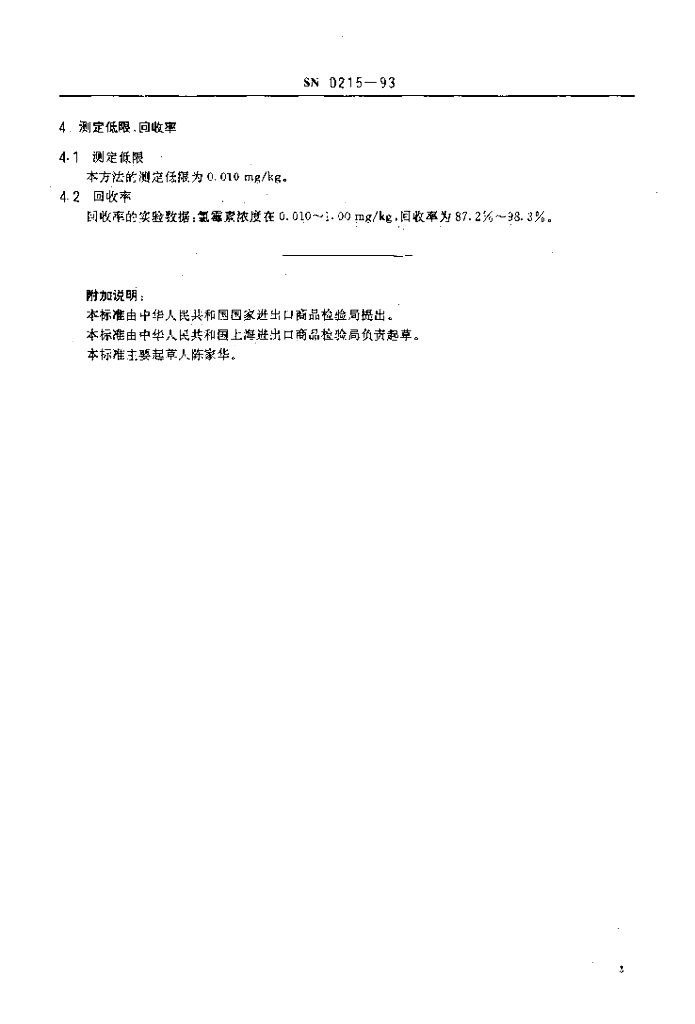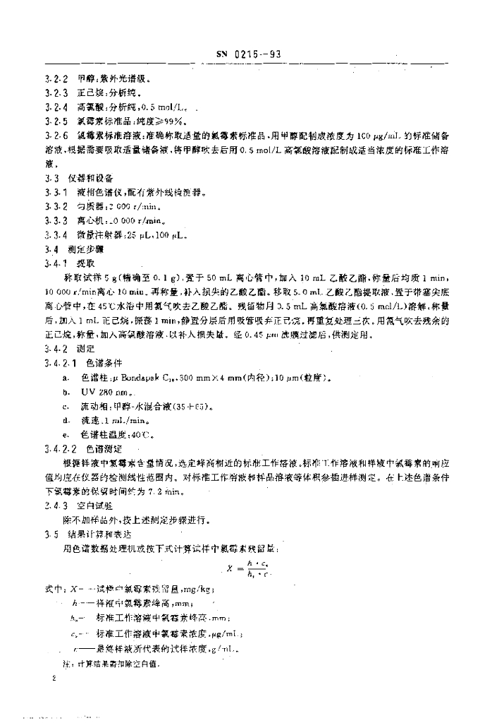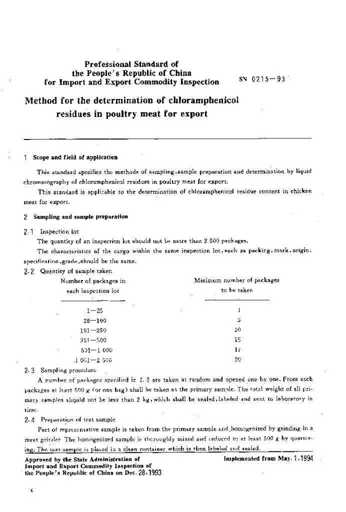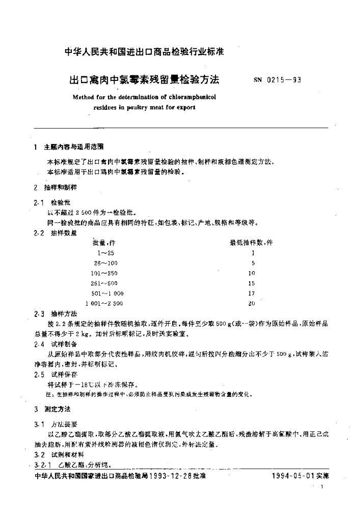 SN 0215-1993 出口禽肉中氯霉素残留量检验方法