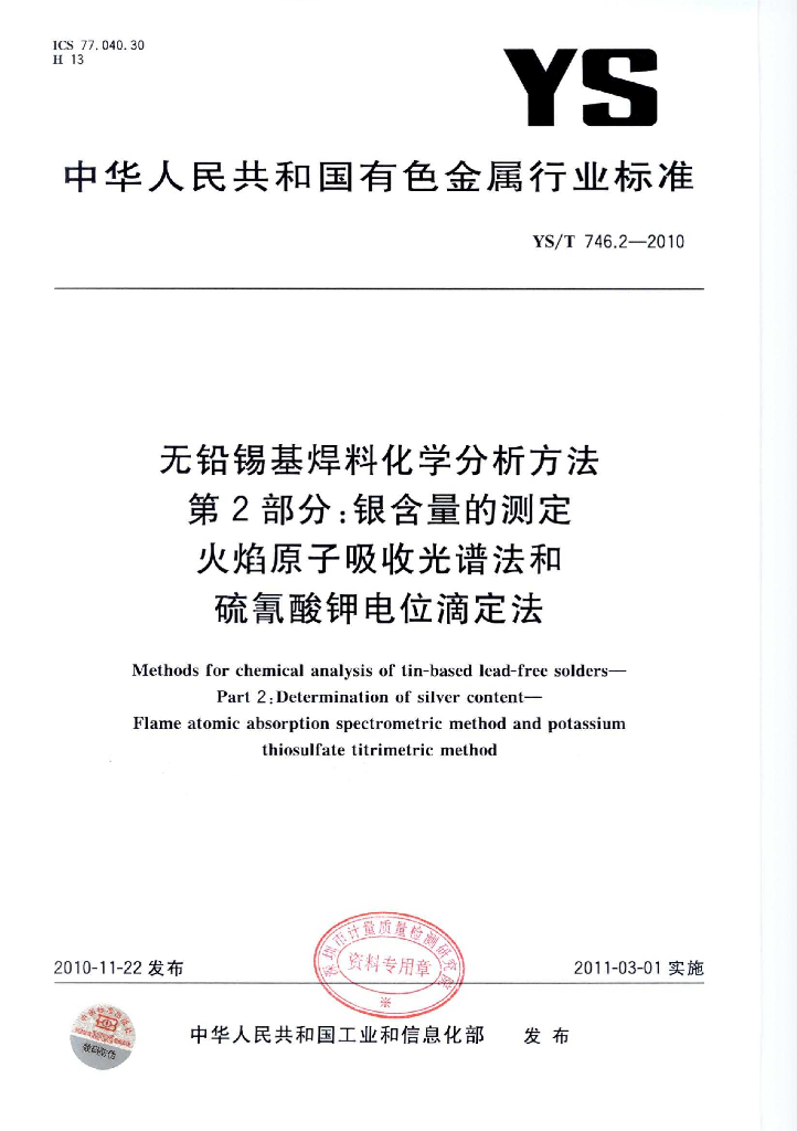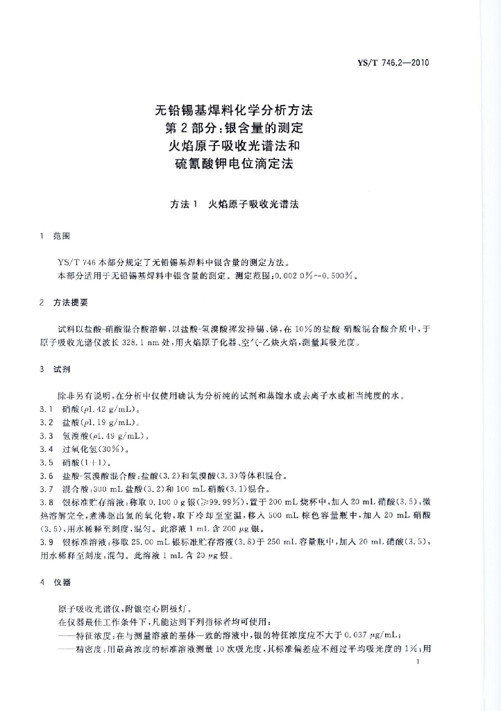YS/T 746.2-2010 无铅锡基焊料化学分析方法 第2部分:银含量的测定 火焰原子吸收光谱法和硫氰酸钾电位滴定法