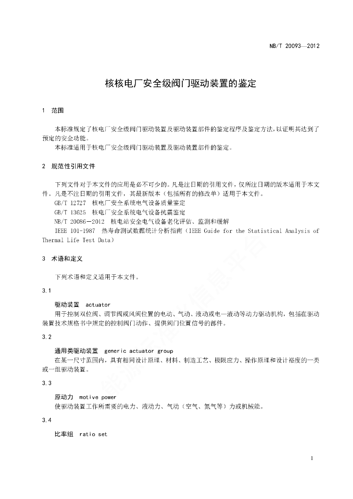 NB/T 20093-2012 核电厂安全级阀门驱动装置的鉴定