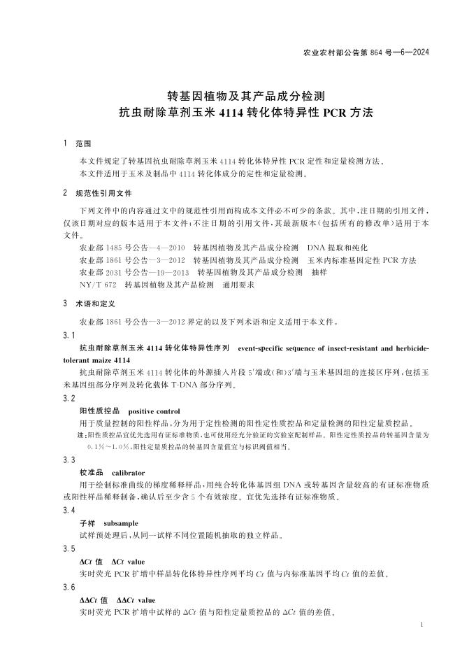 农业农村部公告 第864号-6-2024 转基因植物及其产品成分检测 抗虫耐除草剂玉米4114转化体特异性PCR方法
