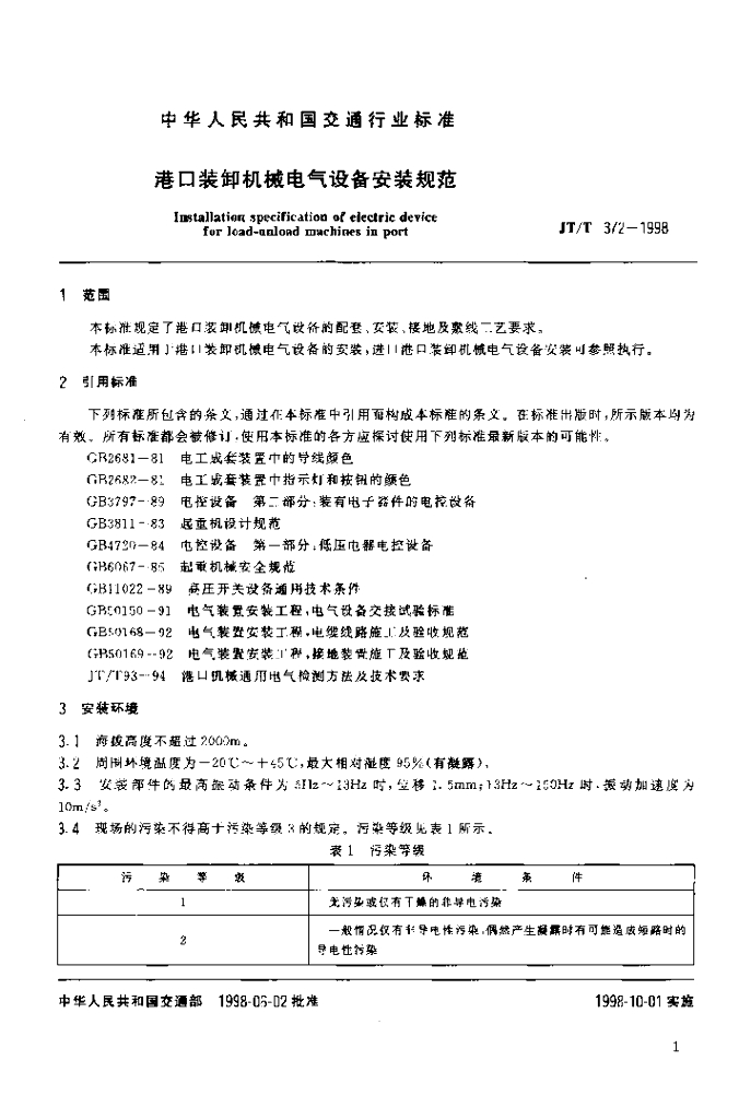 JT/T 372-1998 港口装卸机械电气设备安装规范