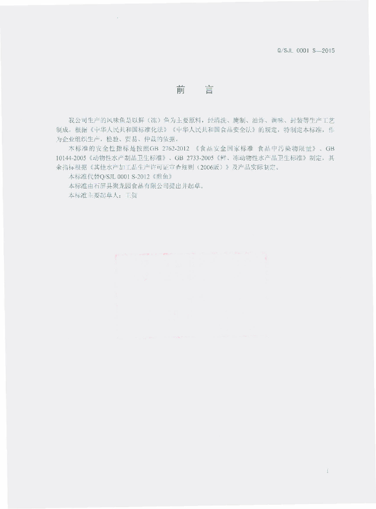Q/SJL 0001S-2015 石屏县聚龙园食品有限公司 风味鱼