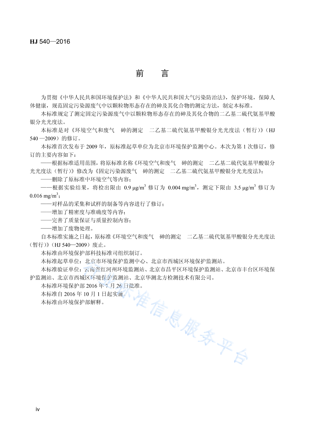 HJ 540-2016 固定污染源废气 砷的测定 二乙基二硫代氨基甲酸银分光光度法