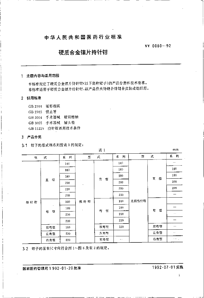YY 0080-1992 硬质合金镶片持针钳