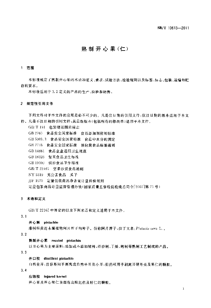 SB/T 10613-2011 熟制开心果(仁)