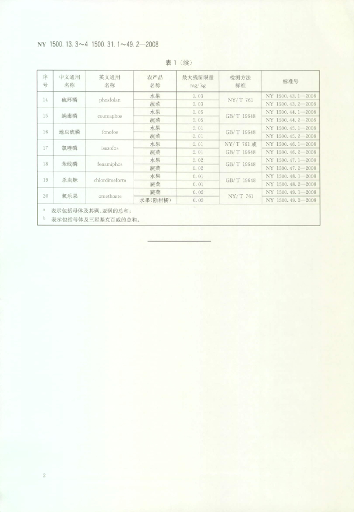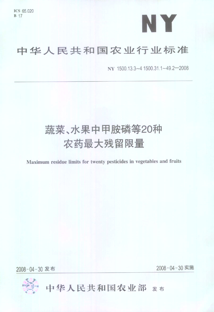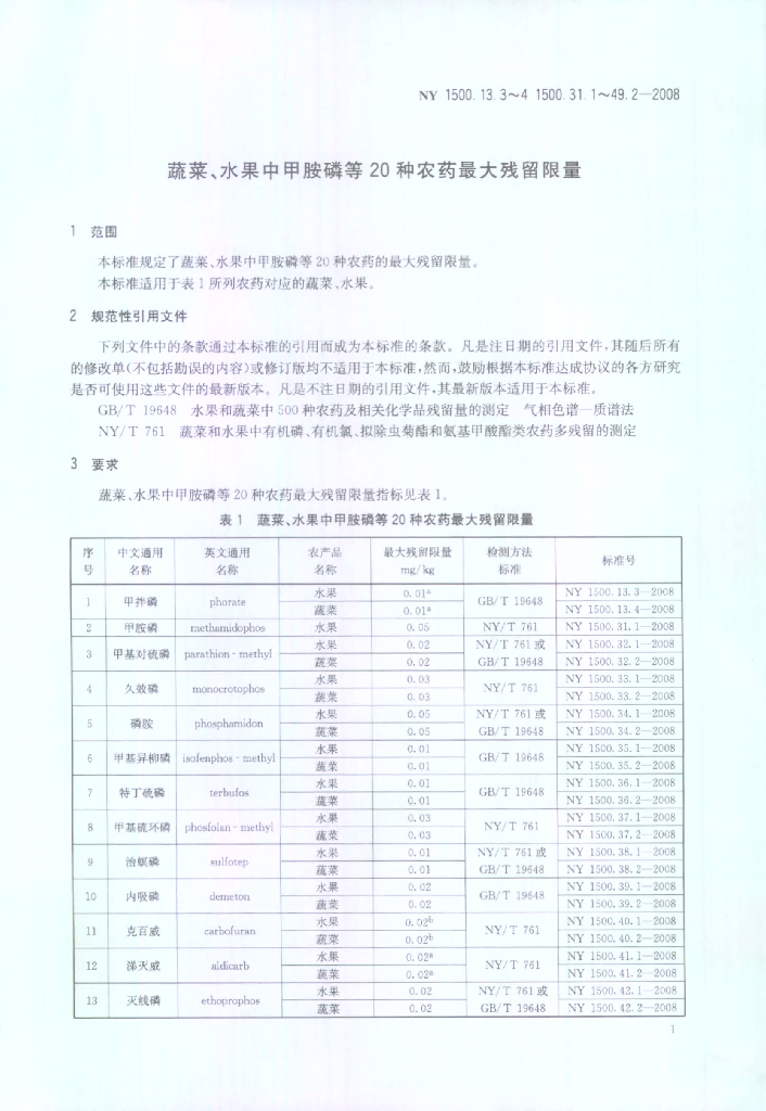 NY 1500.13.3~4 1500.31.1~49.2-2008 蔬菜、水果中甲胺磷等20种农药最大残留限量