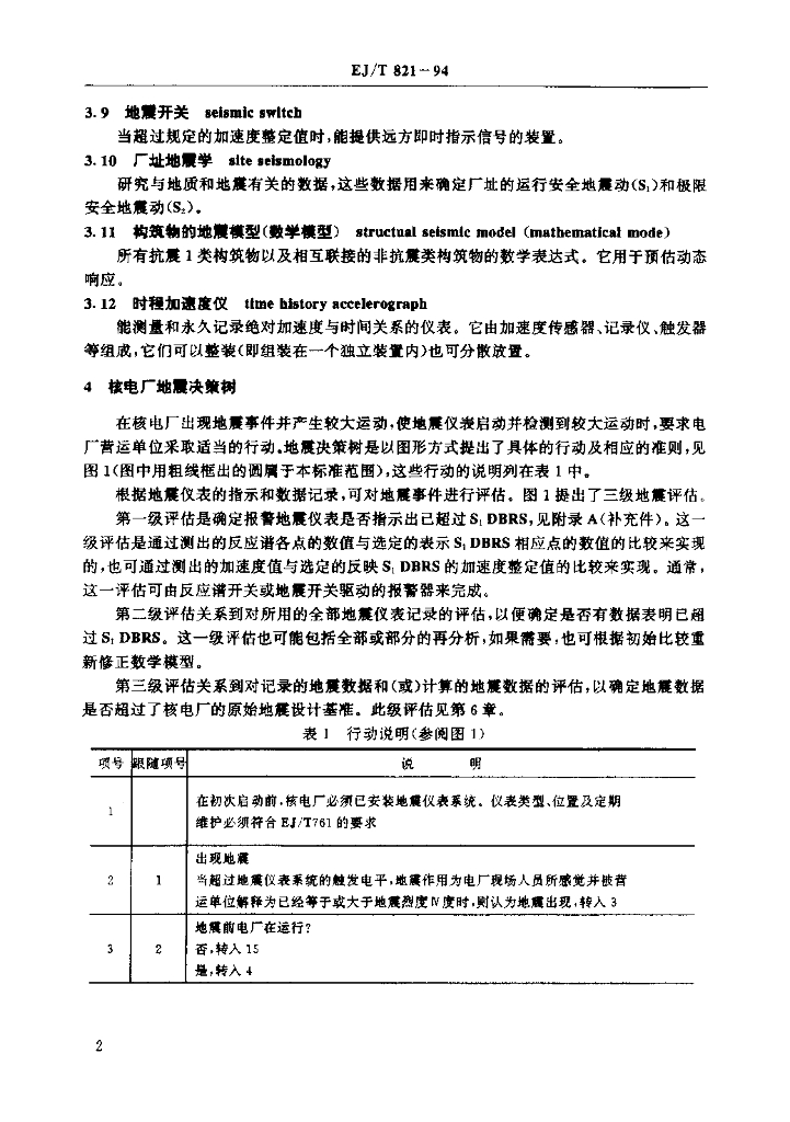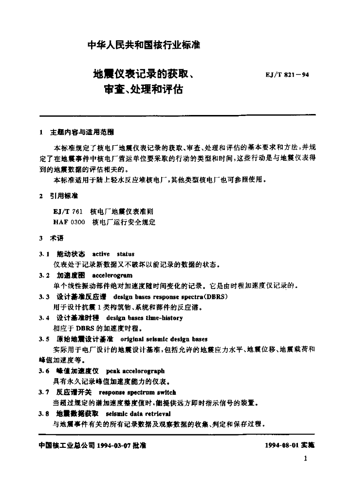 EJ/T 821-1994 核电厂地震仪表记录的获取、审查、处理和评估