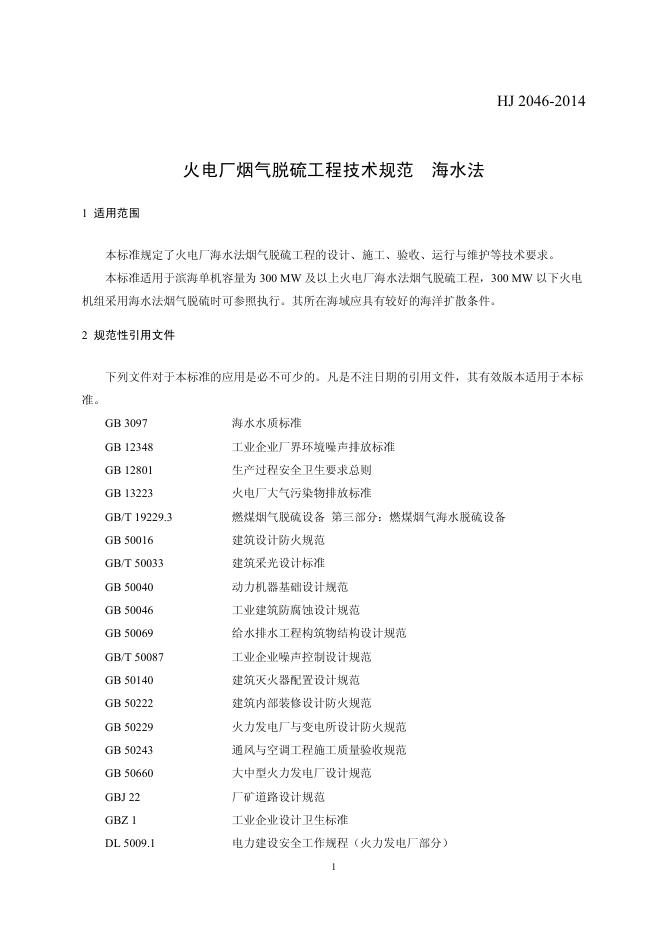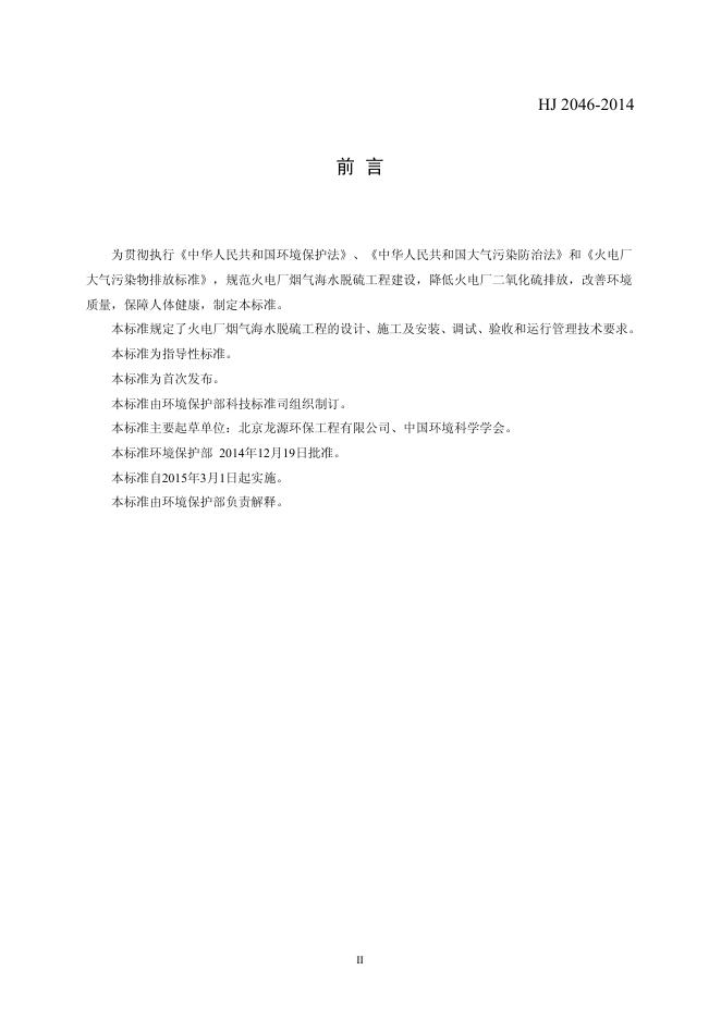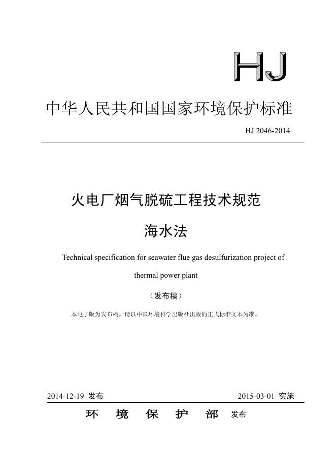 HJ 2046-2014 火电厂烟气脱硫工程技术规范 海水法