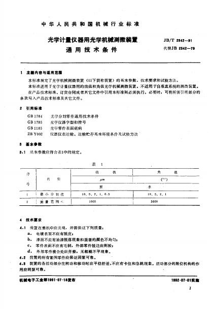 JB/T 2542-1991 光学计量仪器用光学机械测微装置通用技术条件