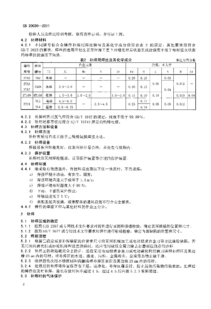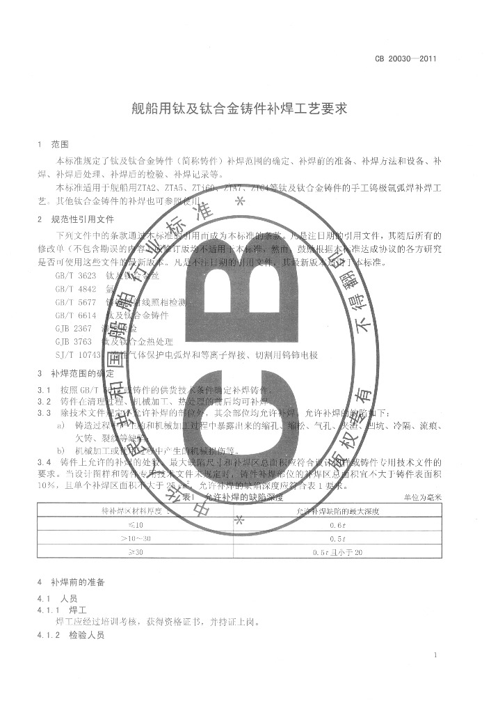 CB 20030-2011 舰船用钛及钛合金铸件补焊工艺要求