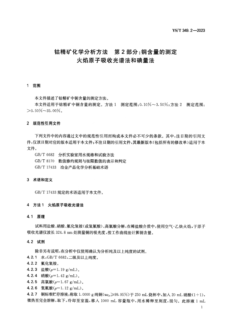 YS/T 349.2-2023 钴精矿化学分析方法 第2部分:铜含量的测定 火焰原子吸收光谱法和碘量法