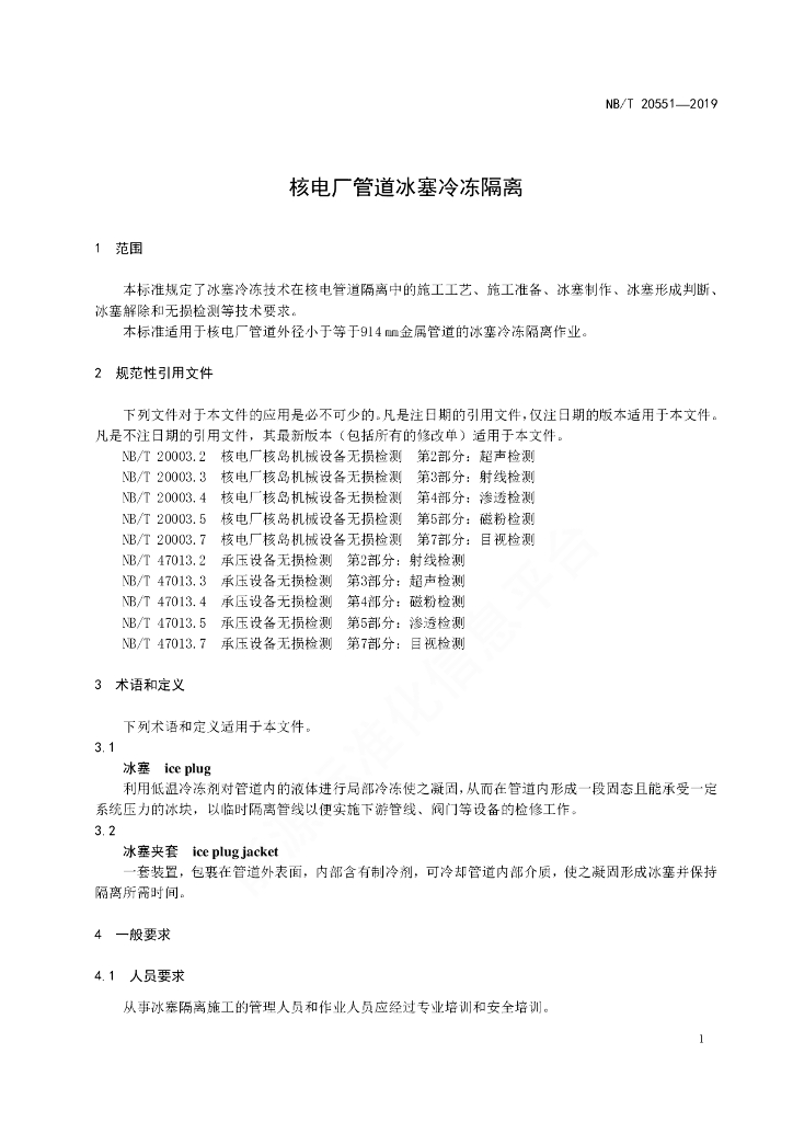 NB/T 20551-2019 核电厂管道冰塞冷冻隔离