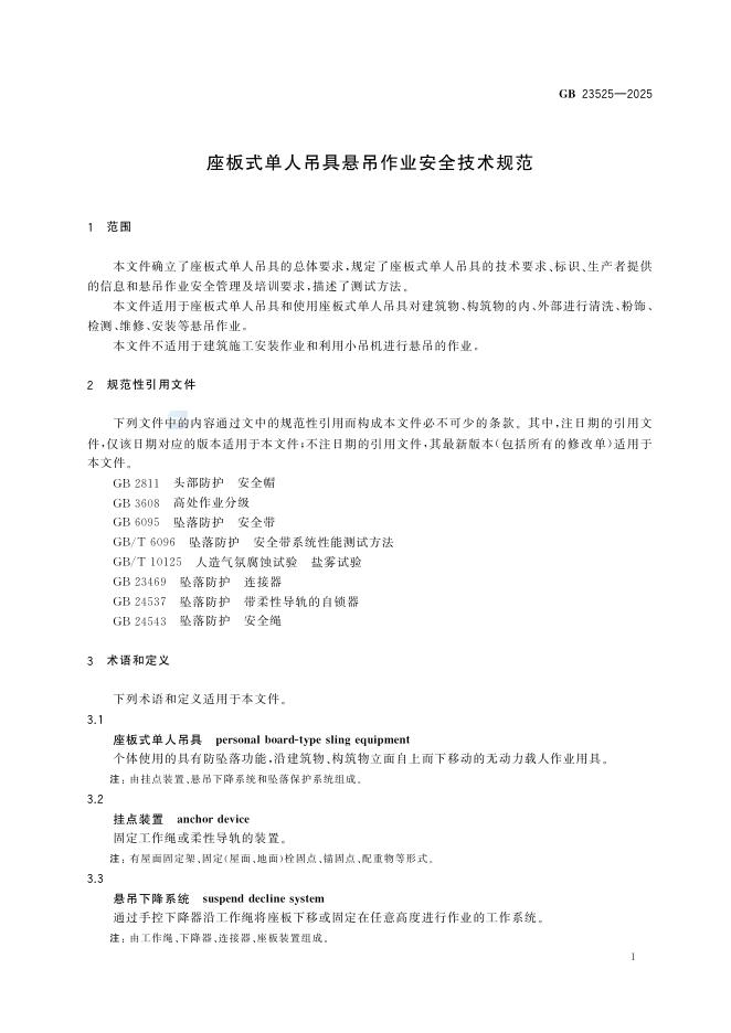 GB 23525-2025 座板式单人吊具悬吊作业安全技术规范
