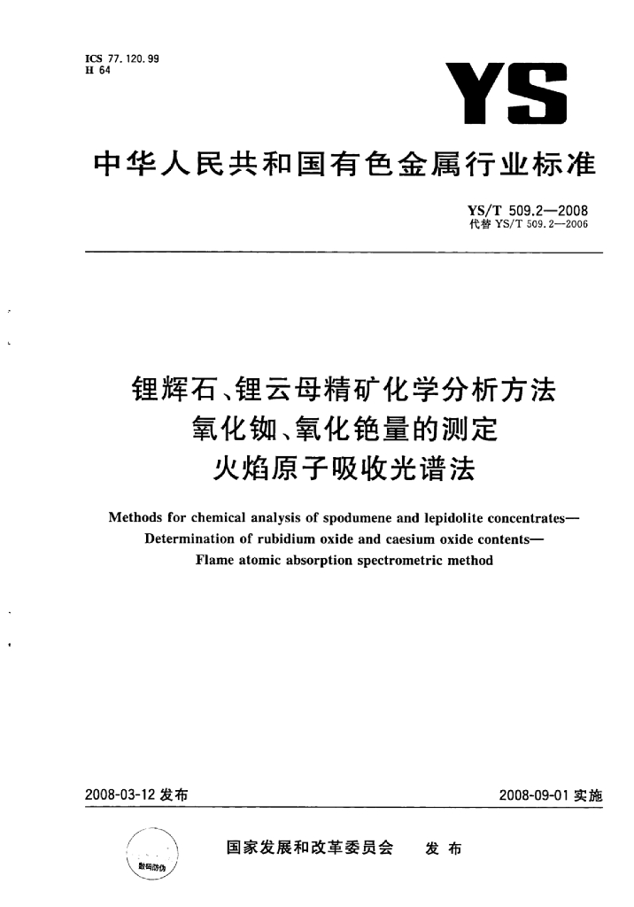 YS/T 509.2-2008 锂辉石、锂云母精矿化学分析方法氧化铷、氧化铯量的测定火焰原子吸收光谱法