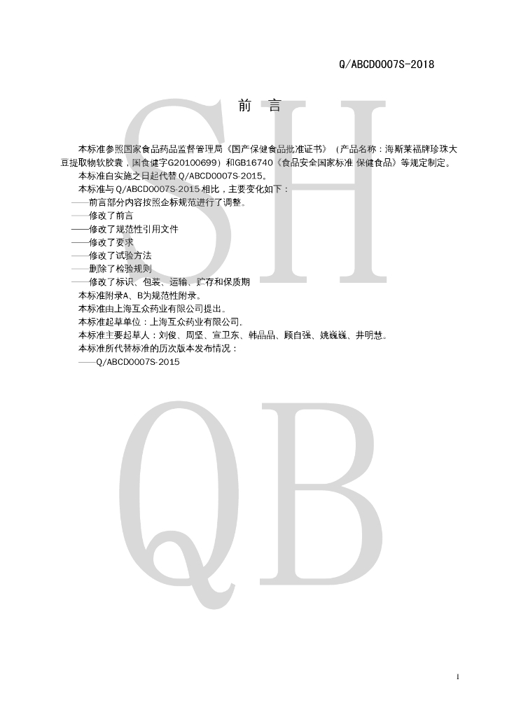 Q/ABCD 0007S-2018 海斯菜福牌珍珠大豆提取物软胶囊