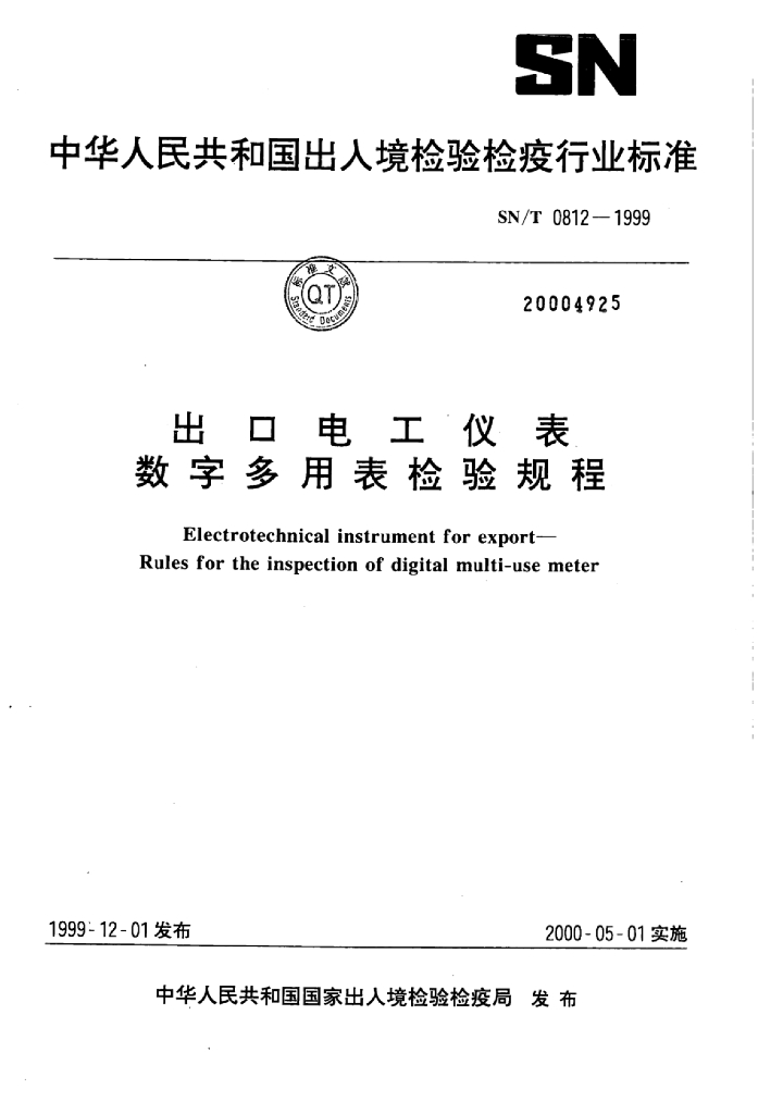SN/T 0812-1999 出口电工仪表数字多用表检验规程