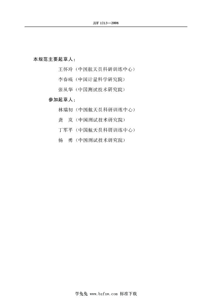 王怀玲(中国航天员科研训练中心)、李春瑛(中国计量科学研究院)、张从华(中国测试技术研究院)、林瑞初(中国航天员科研训练中心)、龚岚(中国测试技术研究院)、丁军平(中国航天员科研训练中心)、杨勇(中国测试技术研究院)