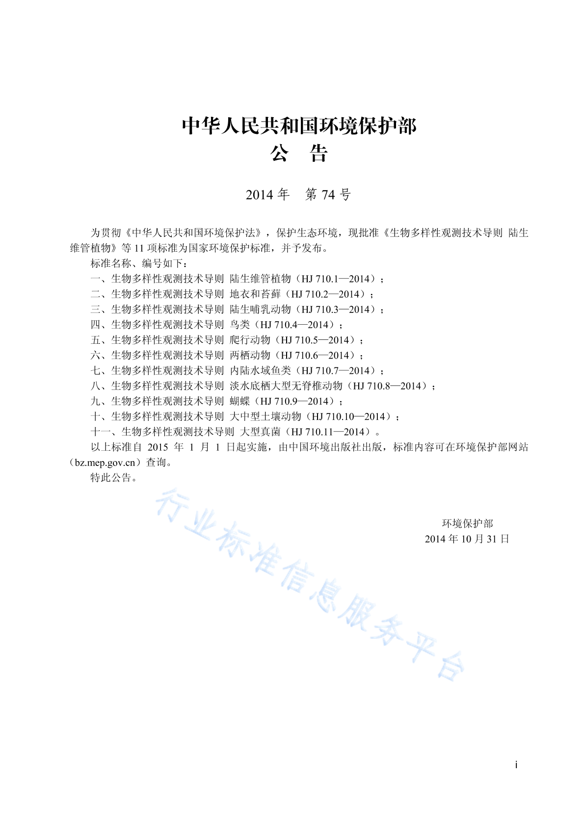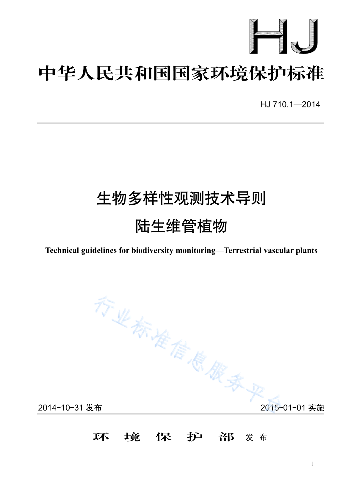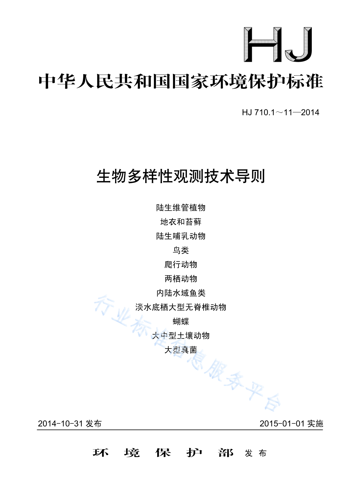 HJ 710.1~11-2014 HJ710.1~11-2014《生物多样性观测技术导则 陆生维管植物》等11项标准