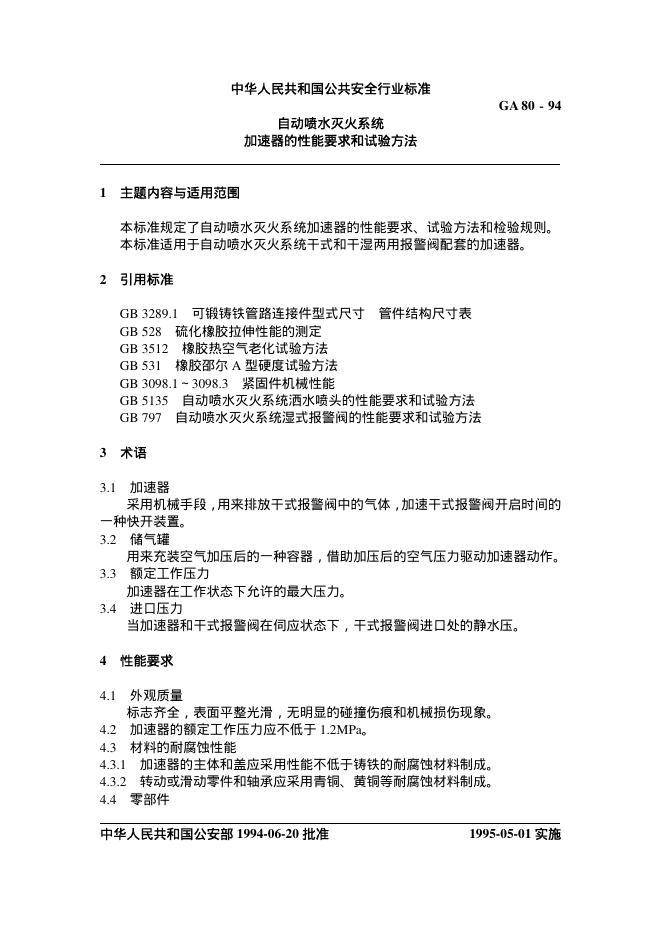 GA 80-1994 自动喷水灭火系统 加速器的性能要求和试验方法