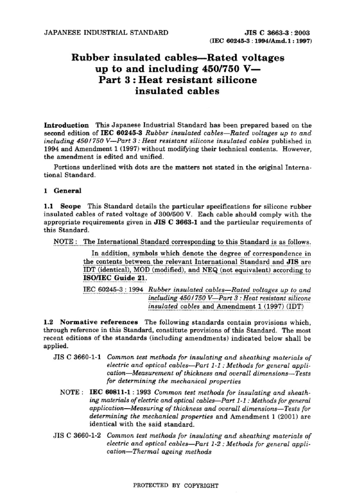 JIS C3663-3:2003 额定电压450/750V以下的橡胶绝缘电缆-第3部分 耐热硅橡胶绝缘电缆