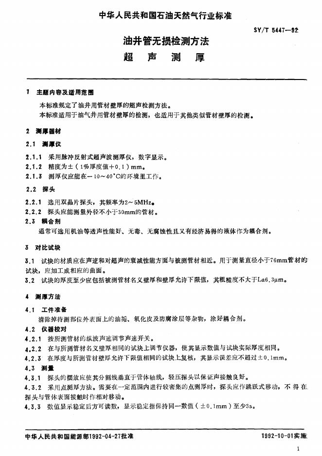 SY/T 5447-1992 油井管无损检测方法 超声测厚
