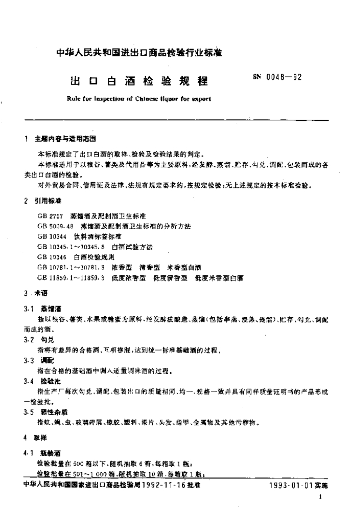 SN 0048-1992 出口白洒检验规程
