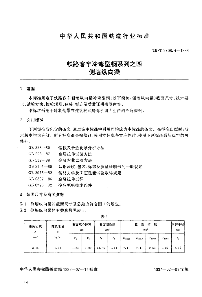 TB/T 2706.4-1996 铁路客车冷弯型钢系列之四侧墙纵向梁