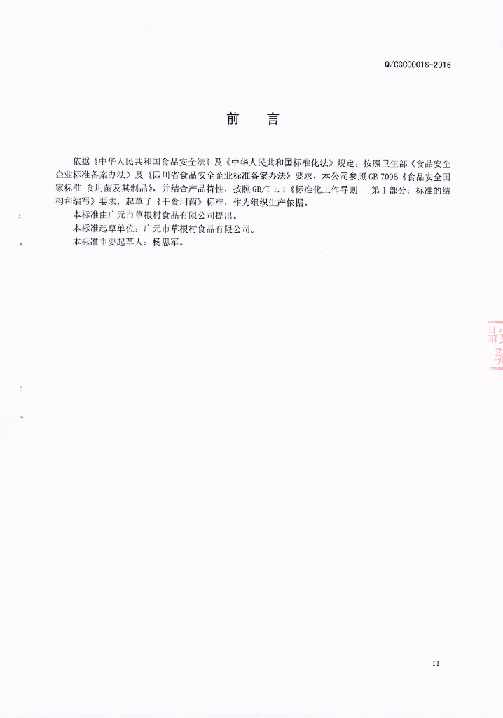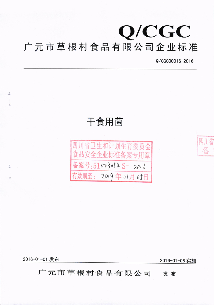 Q/CGC 0001S-2016 广元市草根村食品有限公司 干食用菌