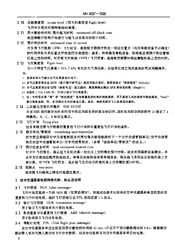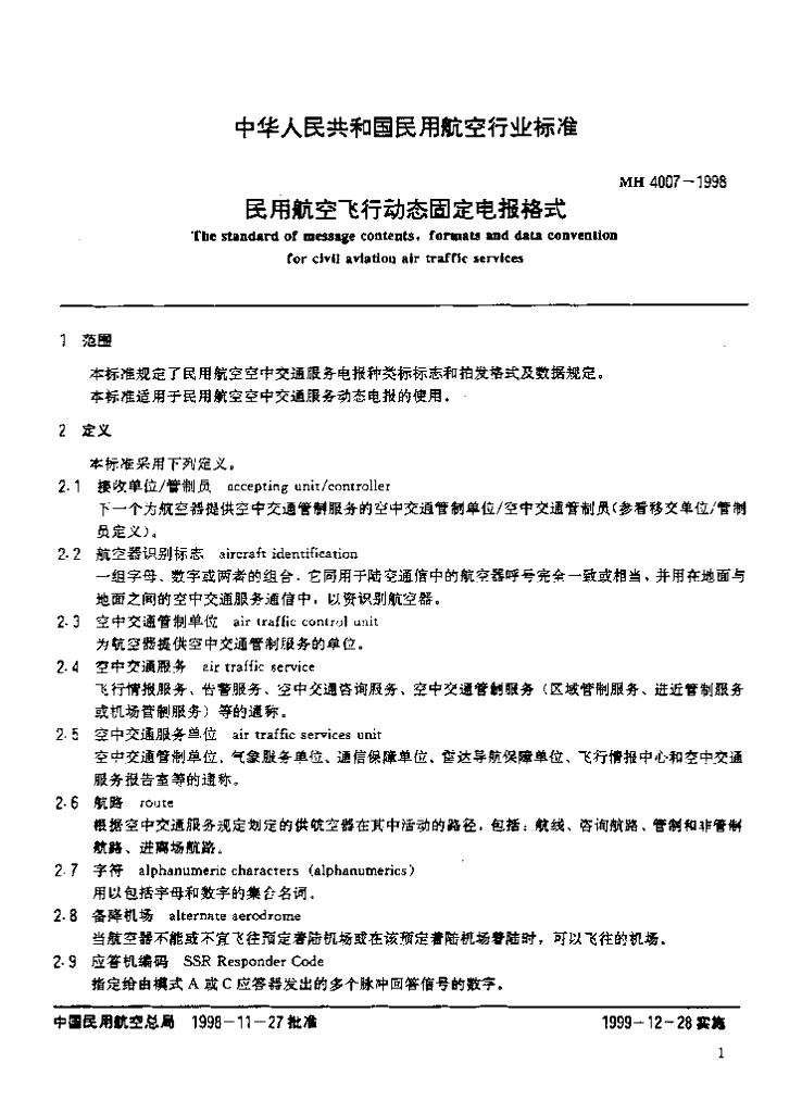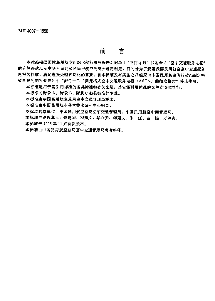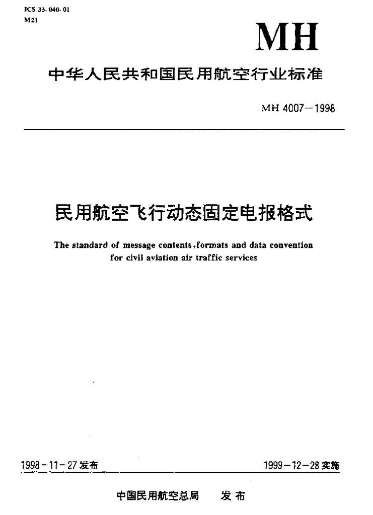 MH 4007-1998 民用航空飞行动态固定电报格式