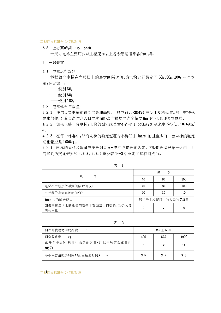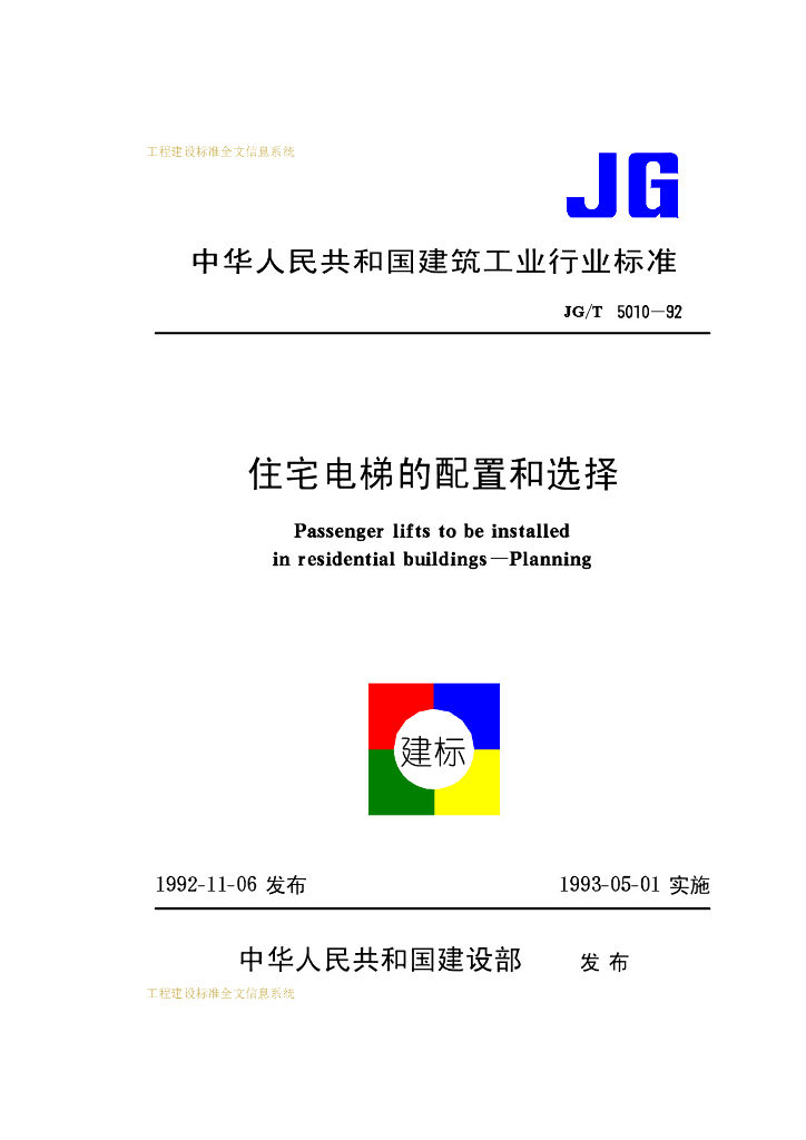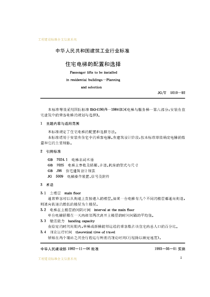 JG/T 5010-1992 住宅电梯的配置和选择