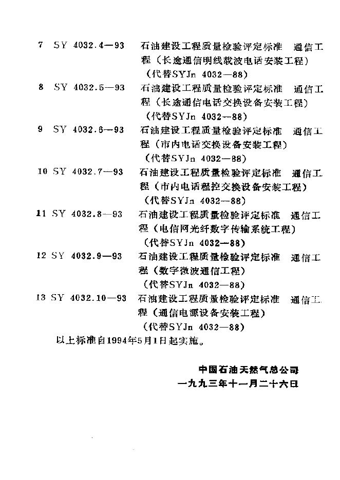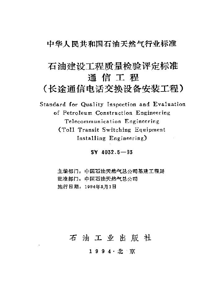 SY 4032.5-1993 石油建设工程质量检验评定通信工程长途通信电话交换设备安装工程