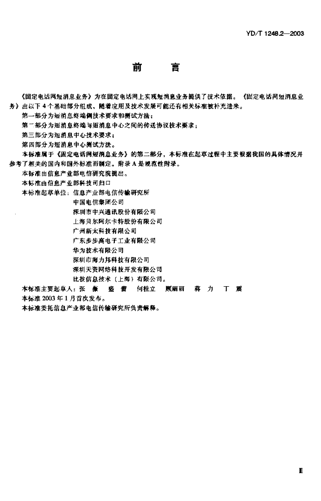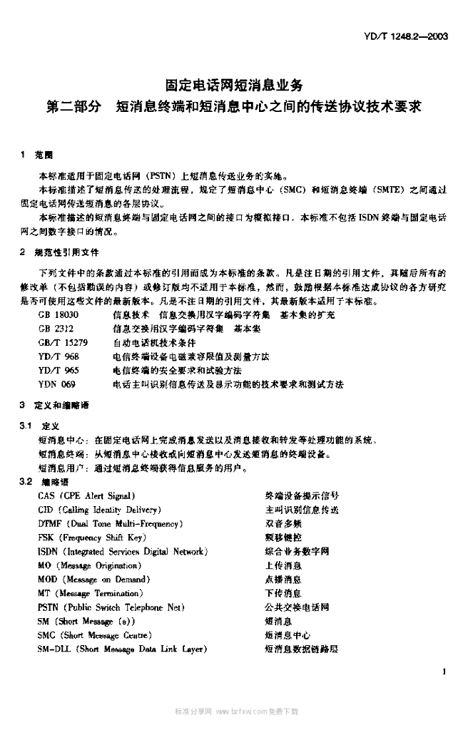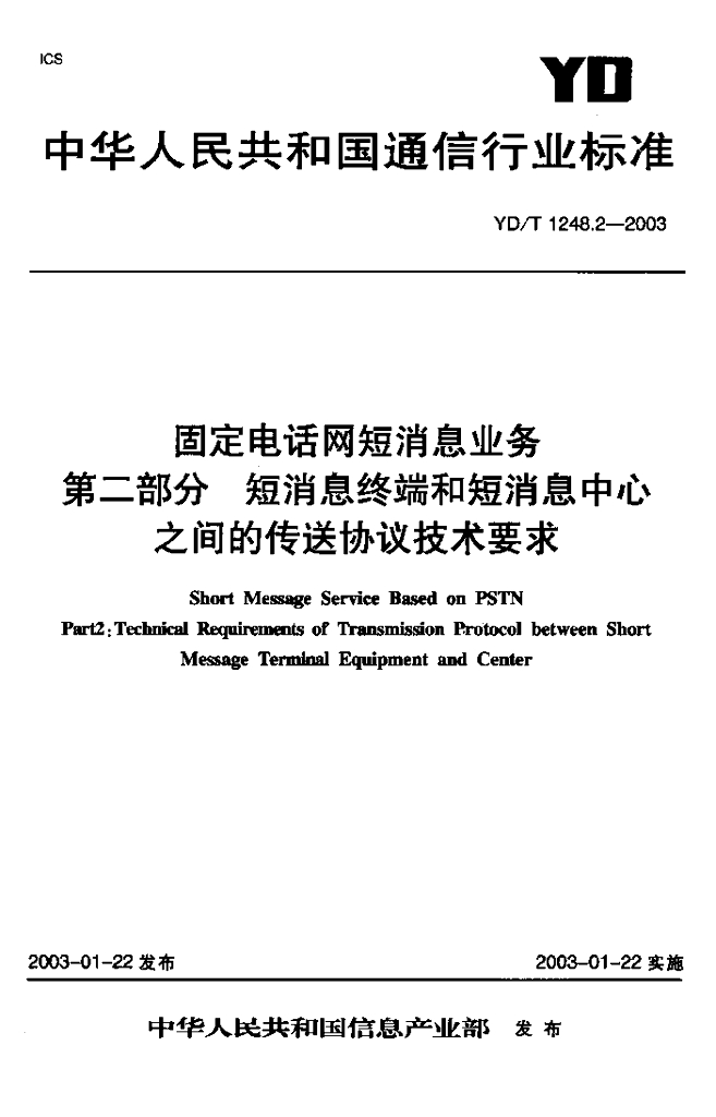 YD/T 1248.2-2003 固定电话网短消息业务 第二部分 短消息终端和短消息中心之间的传送协议技术要求