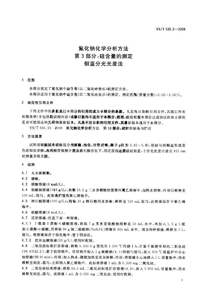 YS/T 535.3-2009 氟化钠化学分析方法 第3部分:硅含量的测定钼蓝分光光度法