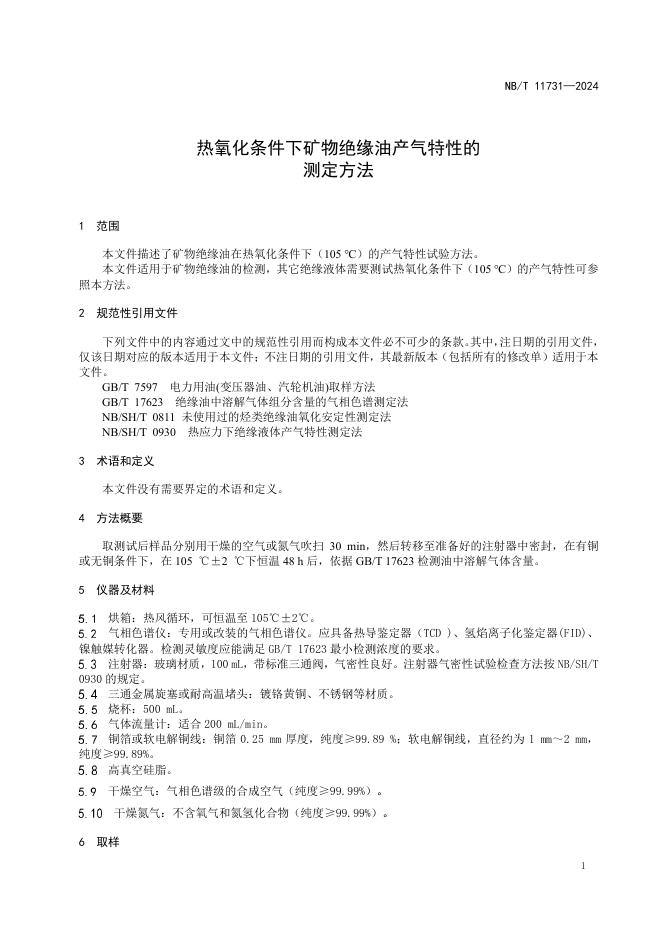 NB/T 11731-2024 热氧化条件下矿物绝缘油产气特性的测定方法