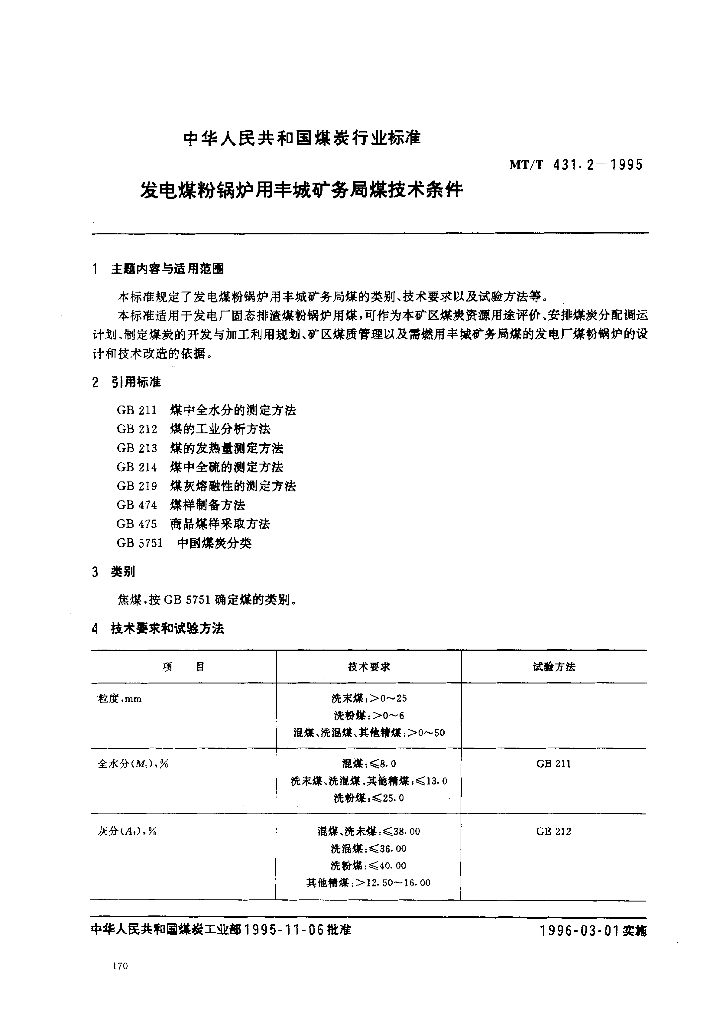 MT/T 431.2-1995 发电煤粉锅炉用丰城矿务局煤技术条件