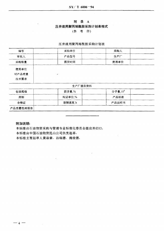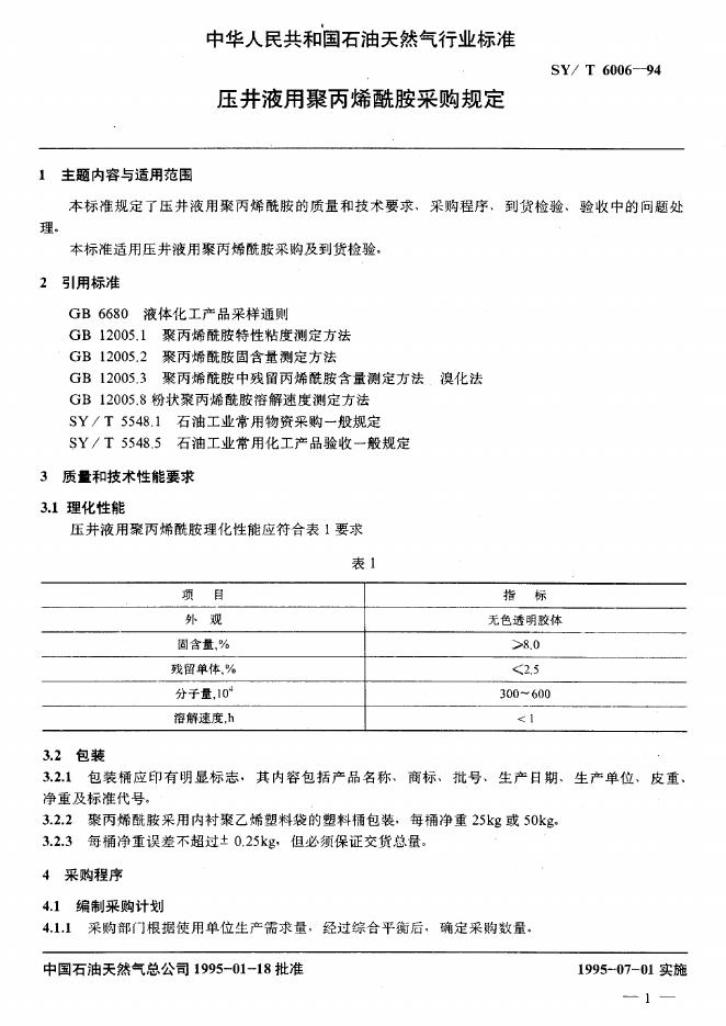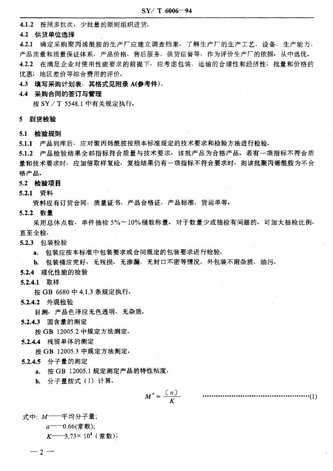 SY/T 6006-1994 压井液用聚丙烯酰胺采购规定