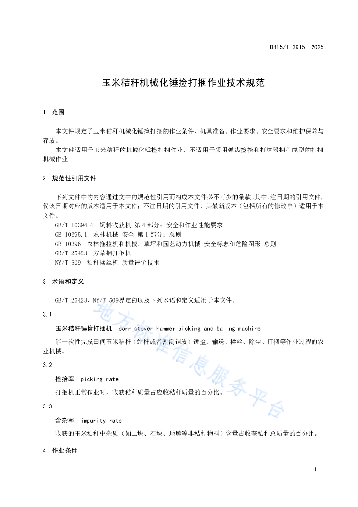 DB15/T 3915-2025 玉米秸秆机械化锤捡打捆作业技术规范
