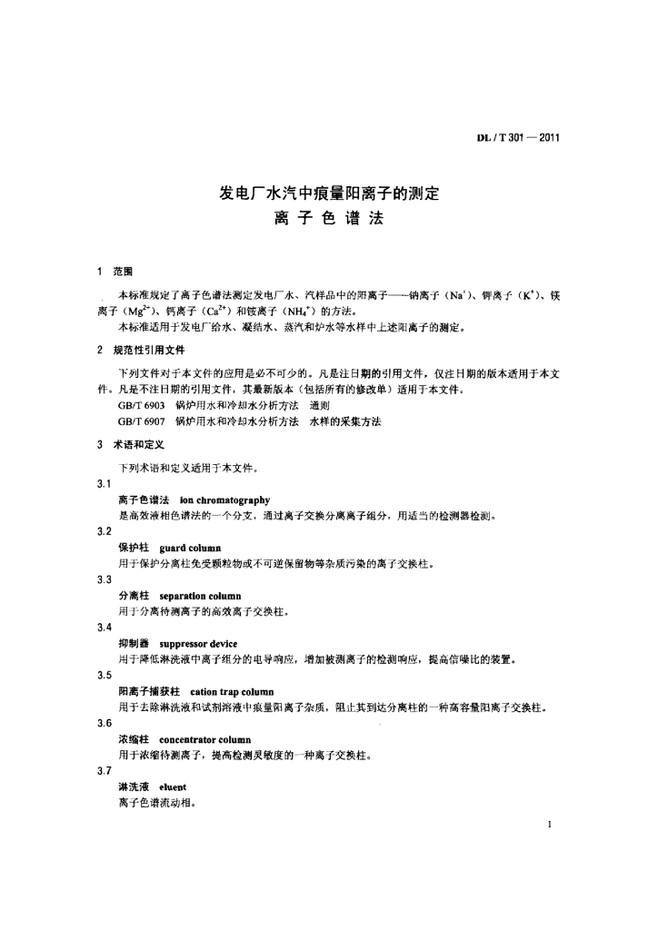 DL/T 301-2011 发电厂水汽中痕量阳离子的测定离子色谱法