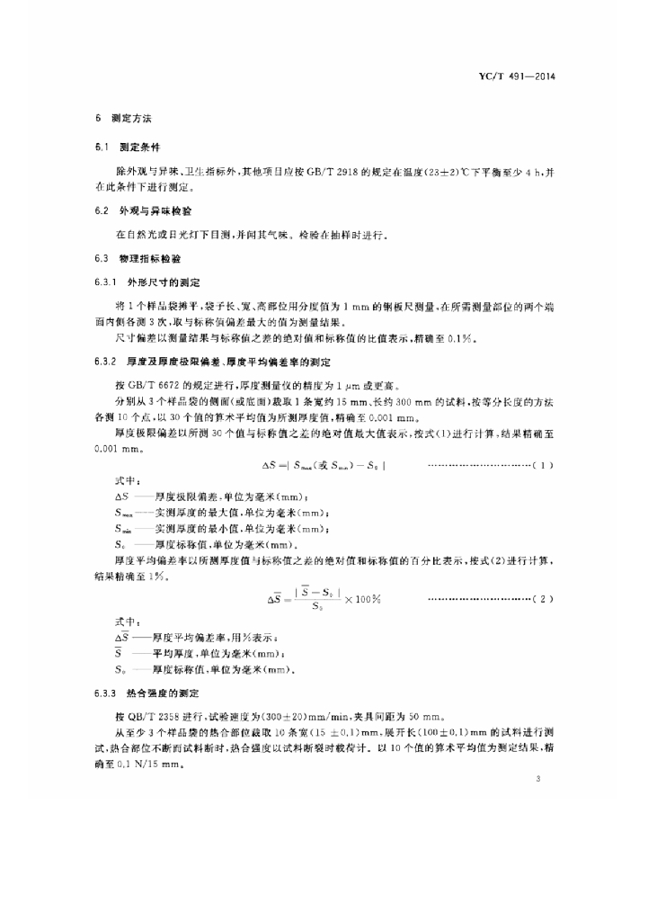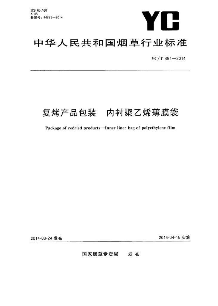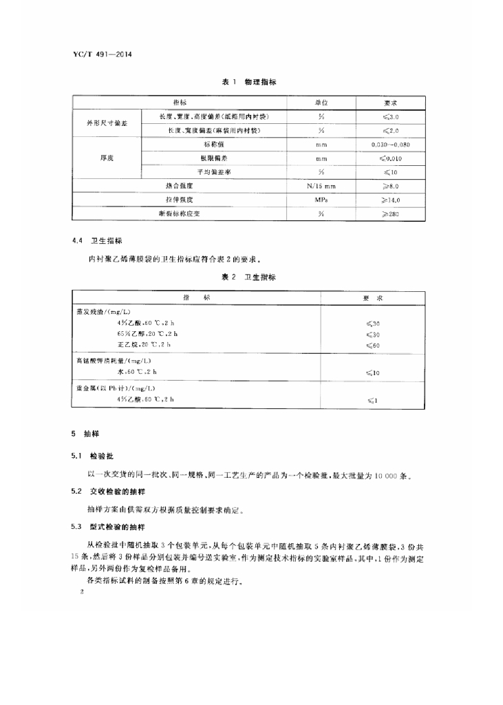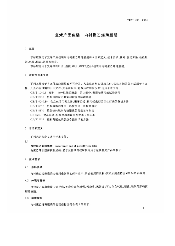 YC/T 491-2014 复烤产品包装 内衬聚乙烯薄膜袋
