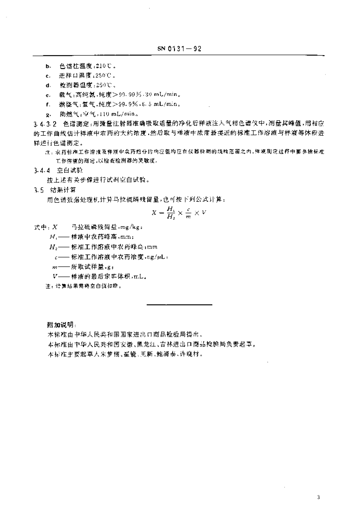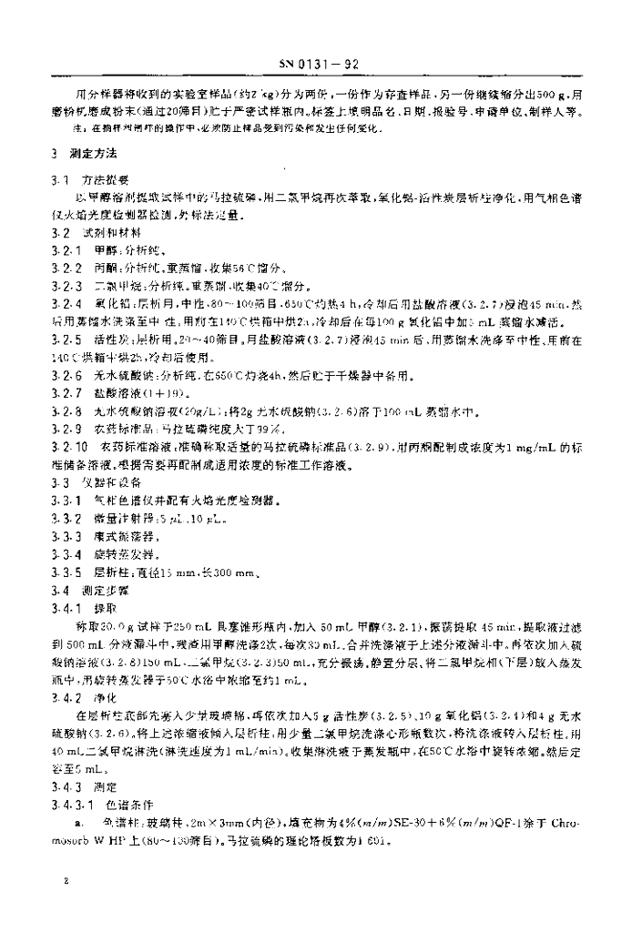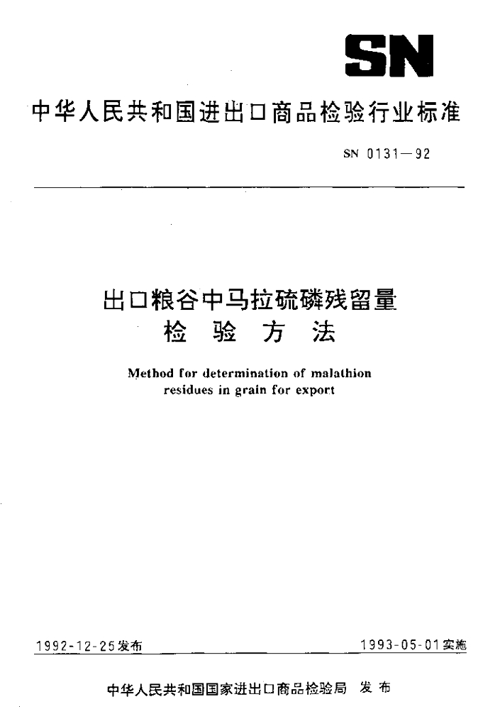 SN 0131-1992 出口粮谷中马拉硫磷残留量检验方法