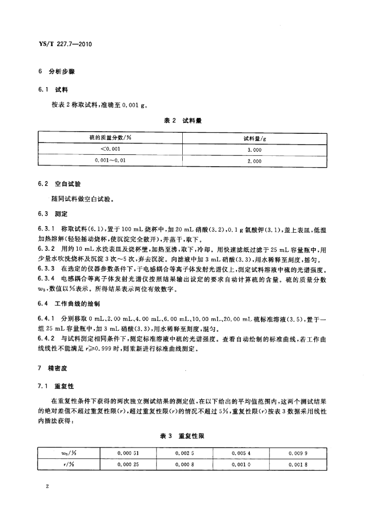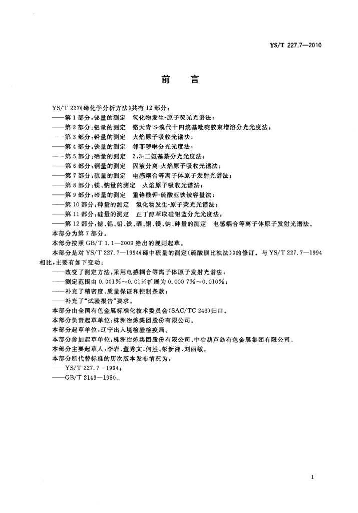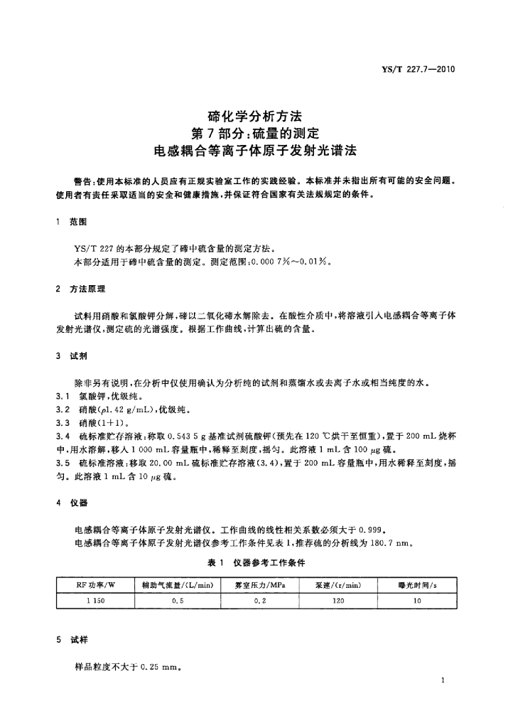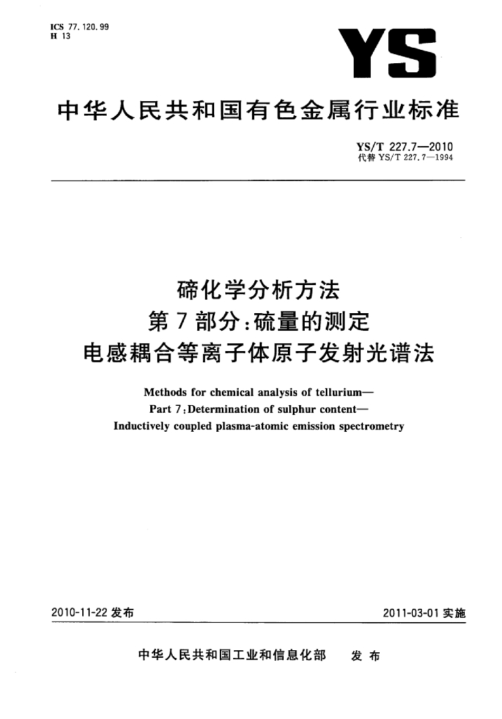 YS/T 227.7-2010 碲化学分析方法 第7部分:硫量的测定电感耦合等离子体原子发射光谱法