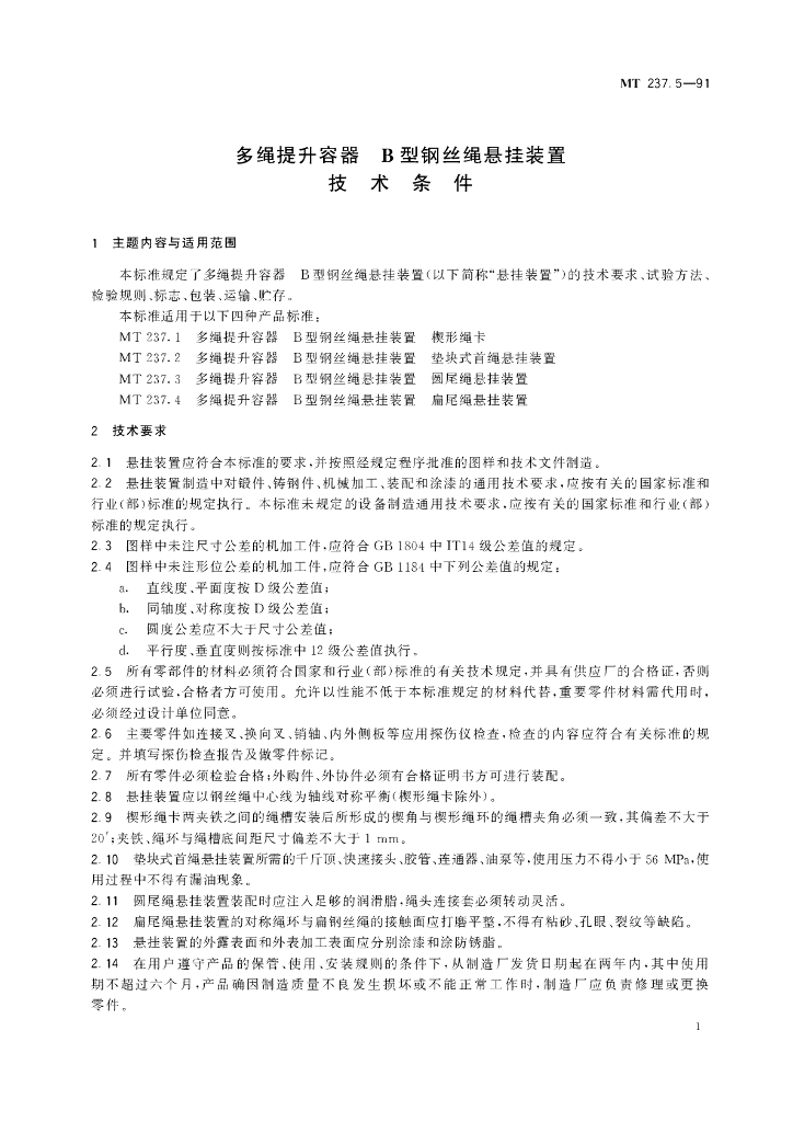 MT 237.5-1991 多绳提升容器 B型钢丝绳悬挂装置技术条件