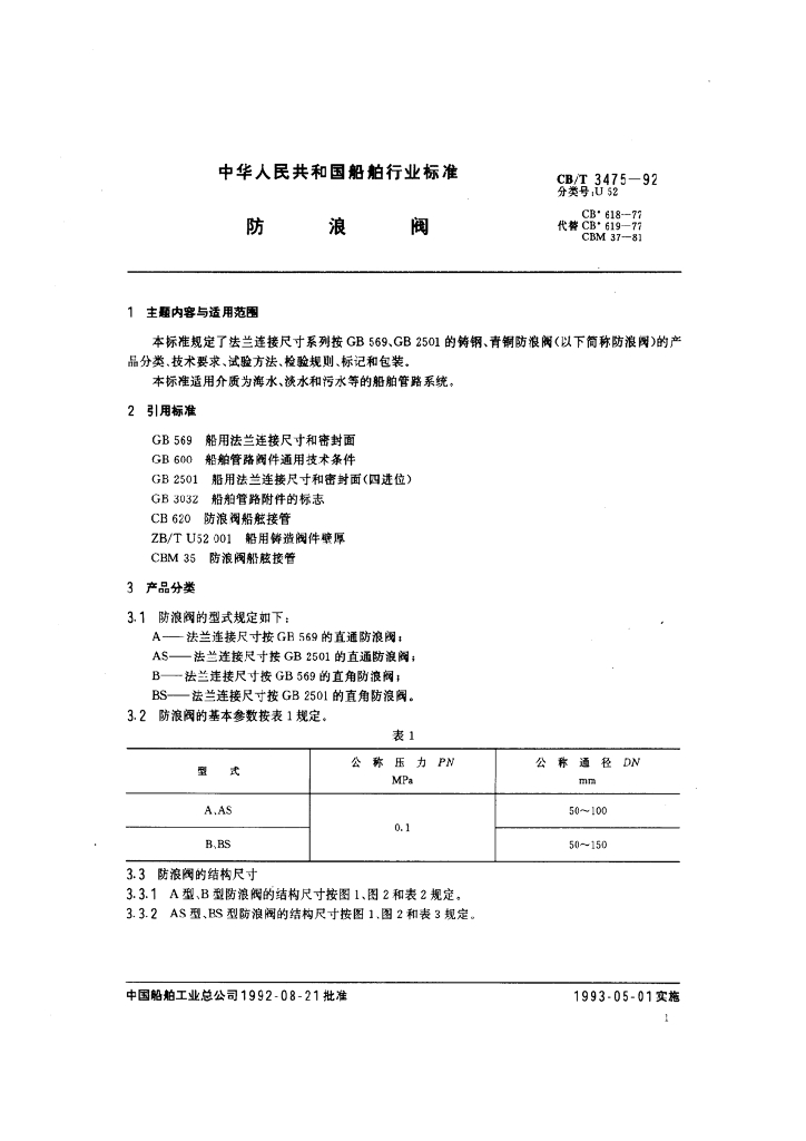 CB/T 3475-1992 防浪阀
