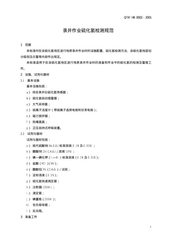 Q/SY HB 0002-2001 中国石油天然气股份有限公司企业标准 录井作业硫化氢检测规范