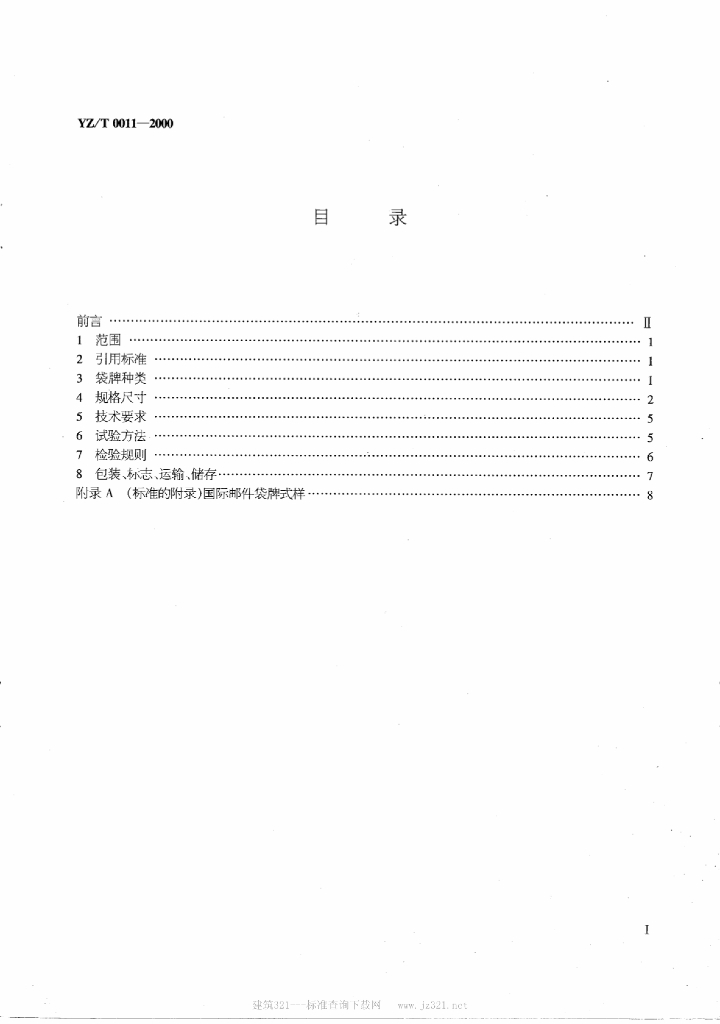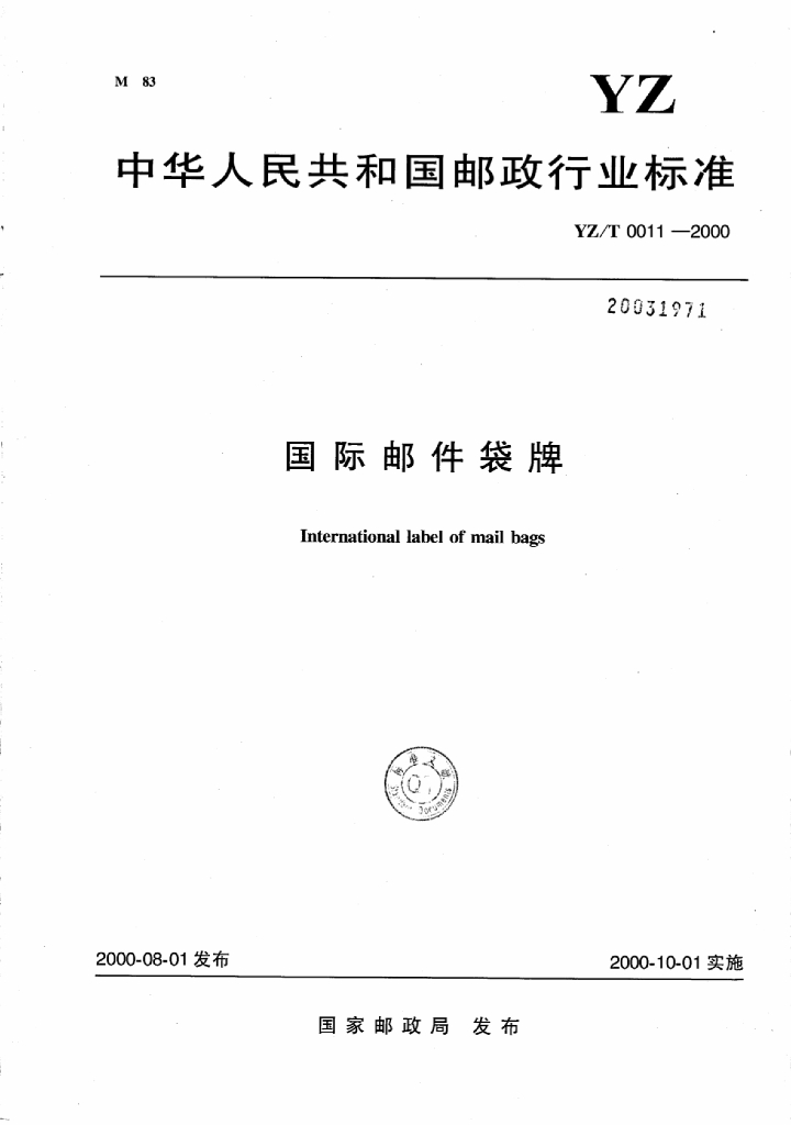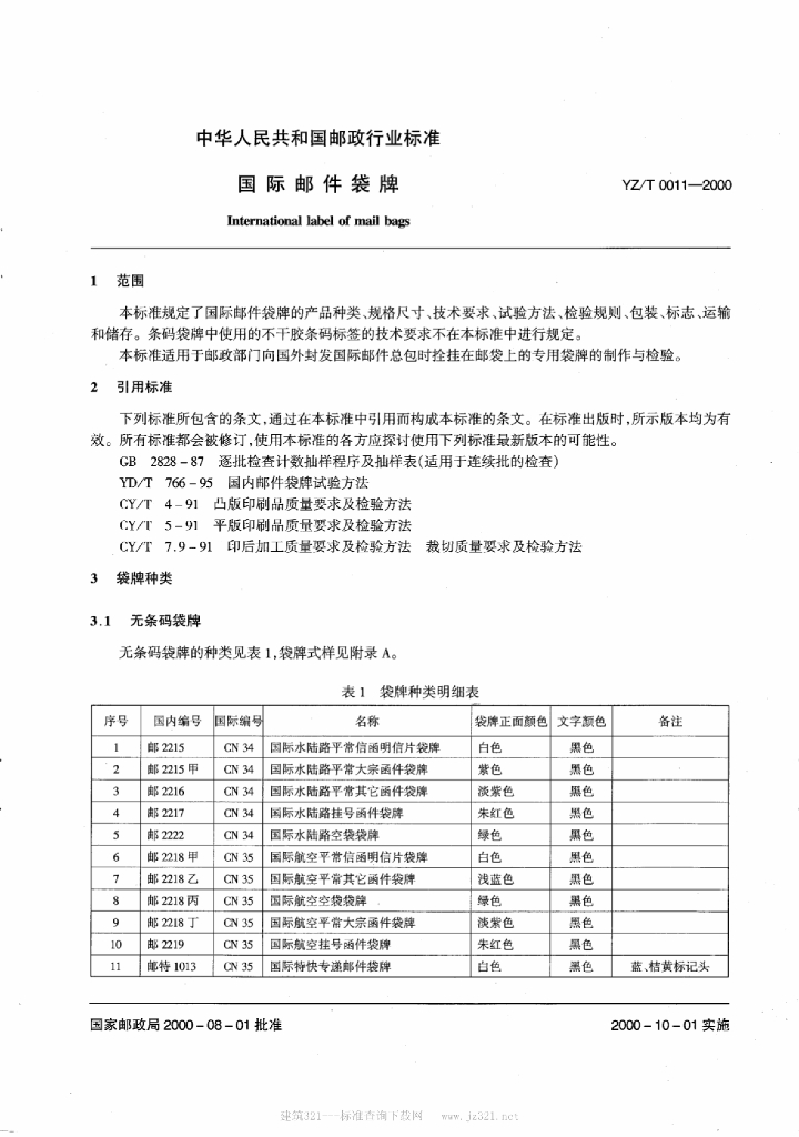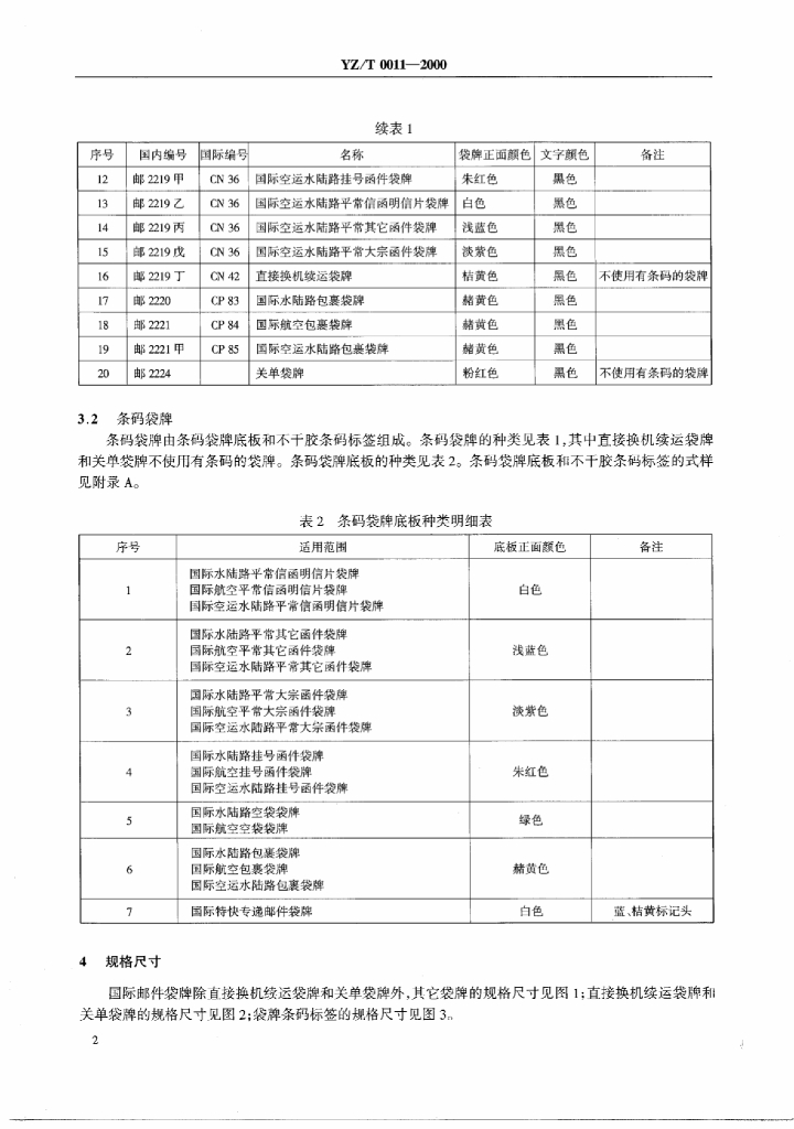 YZ/T 0011-2000 国际邮件袋牌