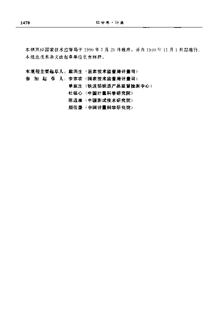 戴润生(国家技术监督局计量司)、李亦农(国家技术监督局计量司)、单叙生(铁道部铁道产品监督检测中心)、杜铭心(中国计量科学研究院)、陈远康(中国测试技术研究院)、周信豪(中国计量科学研究院)